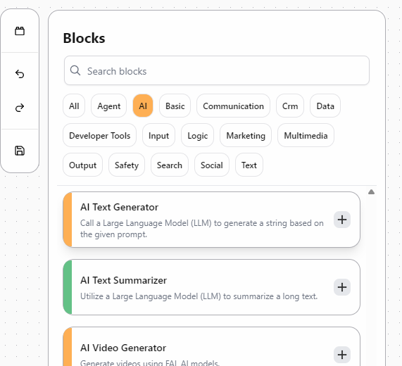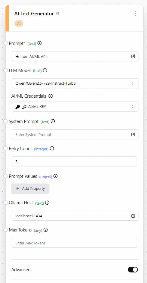 Now that AI/ML API is connected, expand your workflow by chaining additional blocks: